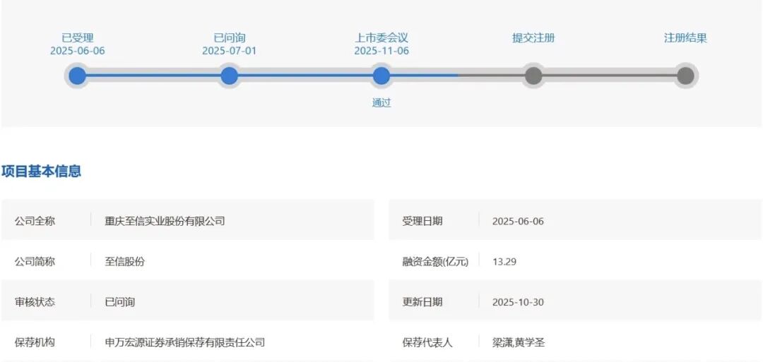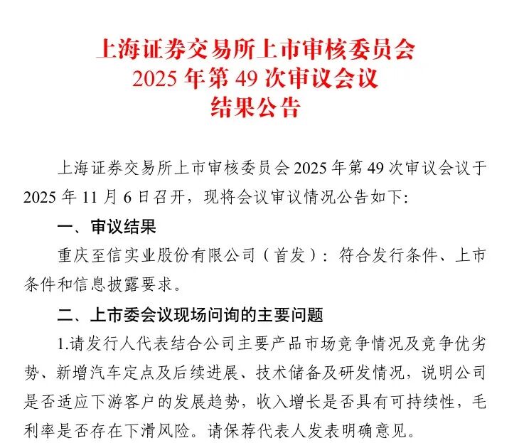 11月6日,上海证券交易所召开2025年第49次上市审核委员会审议会议,审议通过了重庆至信实业股份有限公司(以下简称至信股份)的首发申请。
