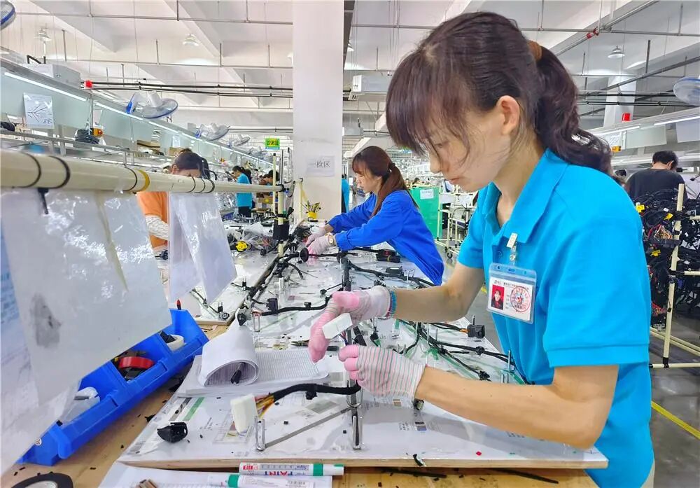 乐仁汽车电子生产制造车间,工人在生产新能源汽车所需的各种线束“前工序车间以半自动及全自动设备为主,完成线束半成品的裁线、铆压等关键环节。”乐仁汽车电子制造部负责人陈熊宣介绍,后工序车间则负责SUB组装、打结、包胶布、电检测试及外观检查,直至成品打包入库,全程可实现高效流转和精准质量控制。