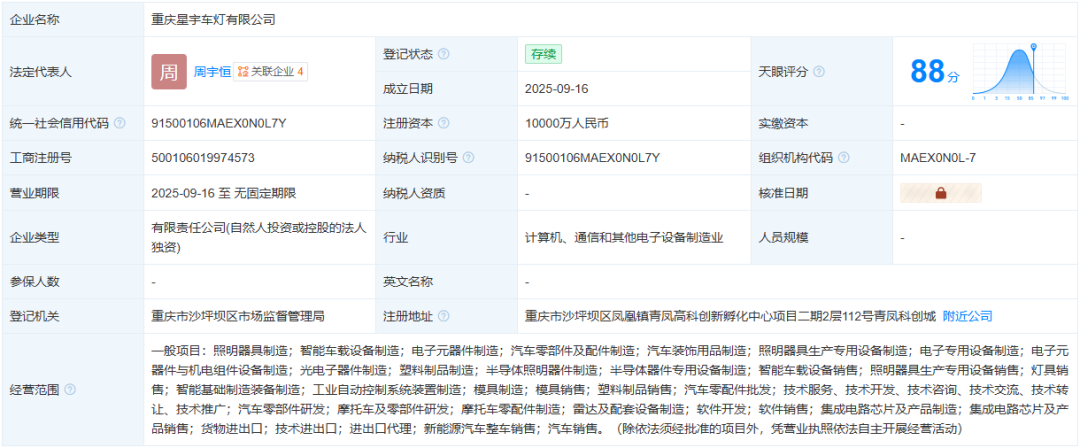 近日,重庆星宇车灯有限公司成立,法定代表人为周宇恒,注册资本1亿元,公司由星宇股份全资持股。公司经营范围包括照明器具制造;智能车载设备制造;电子元器件制造;汽车零部件及配件制造;汽车装饰用品制造;半导体照明器件制造;半导体器件专用设备制造;智能车载设备销售;照明器具生产专用设备销售;灯具销售等。