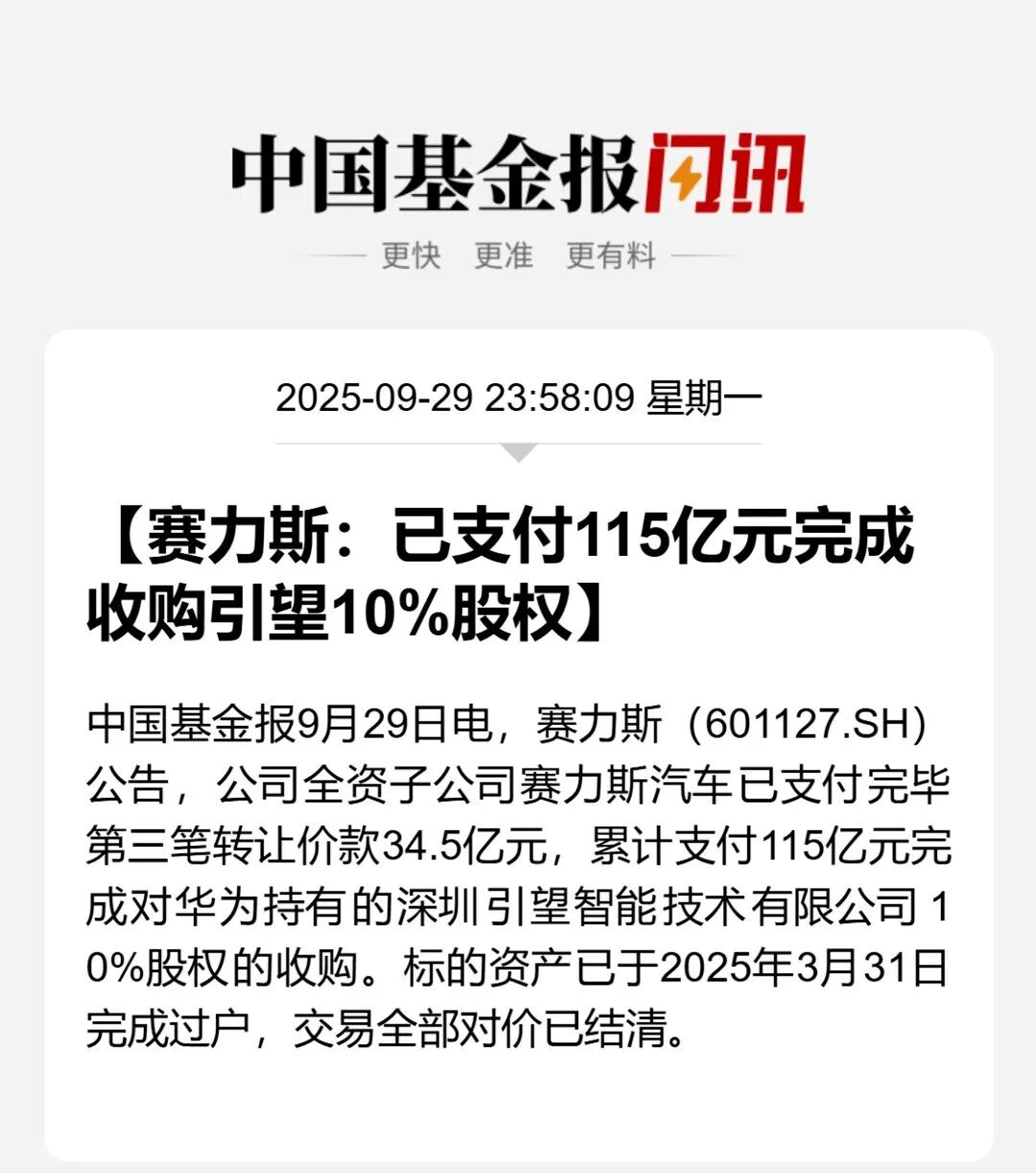 至此,赛力斯汽车购买引望10%股权的所有对价,已经全部支付给了华为。