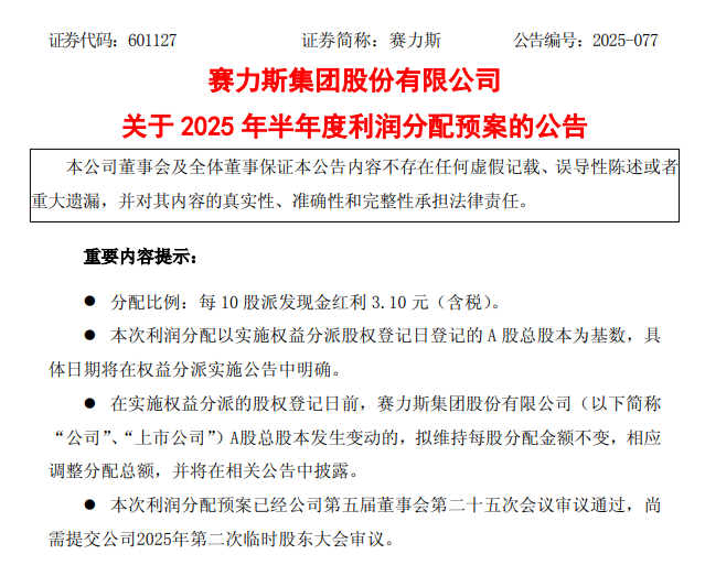 2025年度半年度利润分配预案显示,赛力斯拟以实施权益分派股权登记日登记的A股总股本为基数,向全体A股股东每10股派送现金3.10元(含税)。