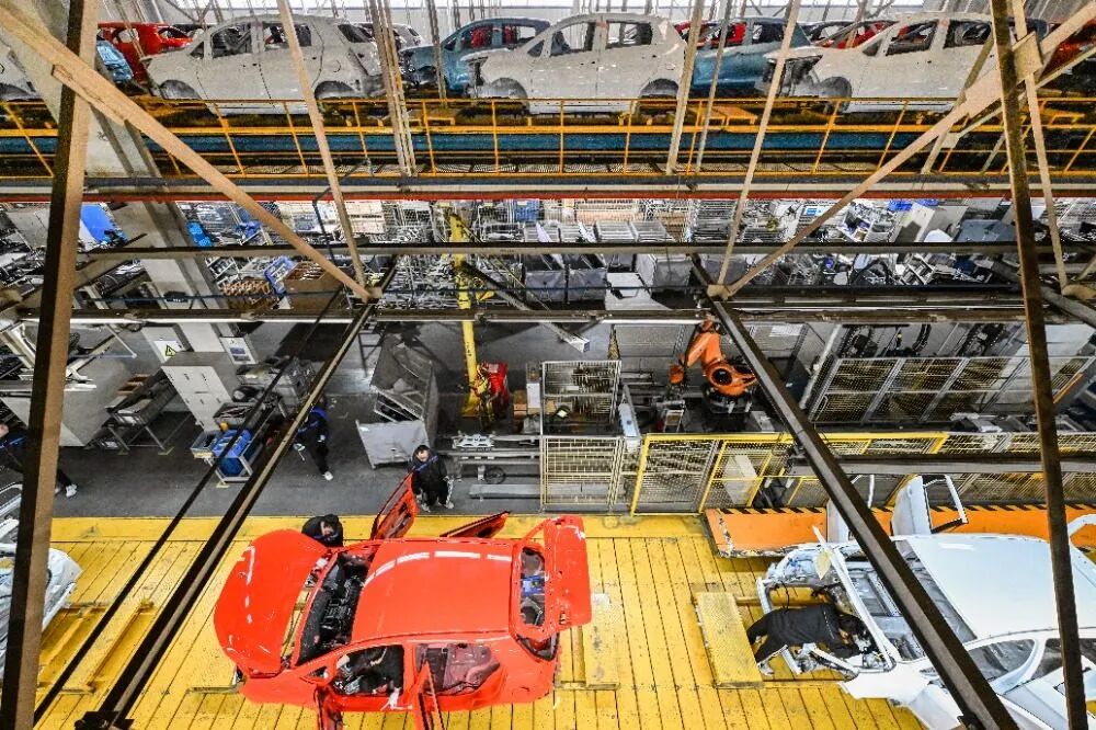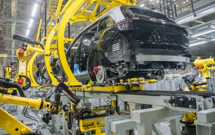 ▲赛力斯汽车超级工厂,总装车间的机器人快速精确地执行生产指令。